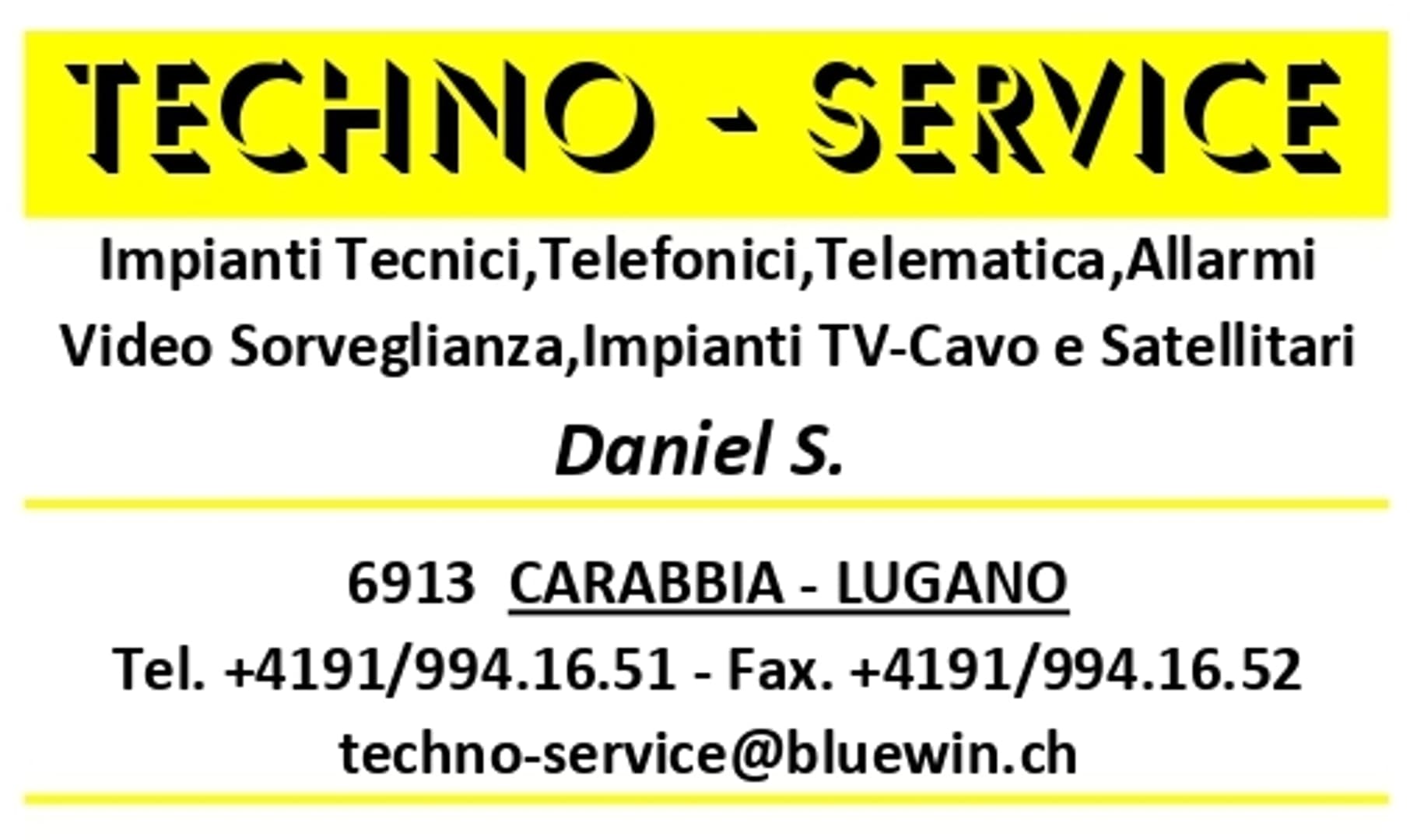 Firm based in Contrada dei Bigatti 3, 6913 Carabbia - Lugano - With over 27 years of experience in Technical Installations,Telephones,Telematics,Alarms,Video Surveillance,TV-Cable and Satellite Installations,Photovoltaic Installations,LED Lighting and RaSi Controls with Independent Controller